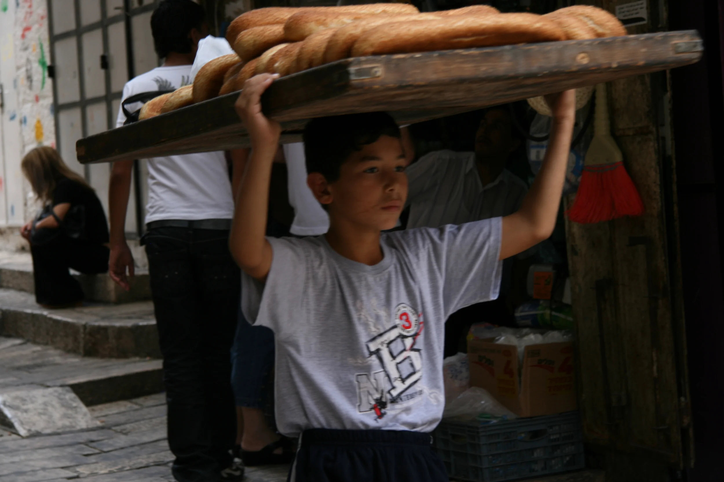 As I stand there I see a young Israeli carrying fresh baked bread on his head while he makes his way through the shadowy streets of the market.