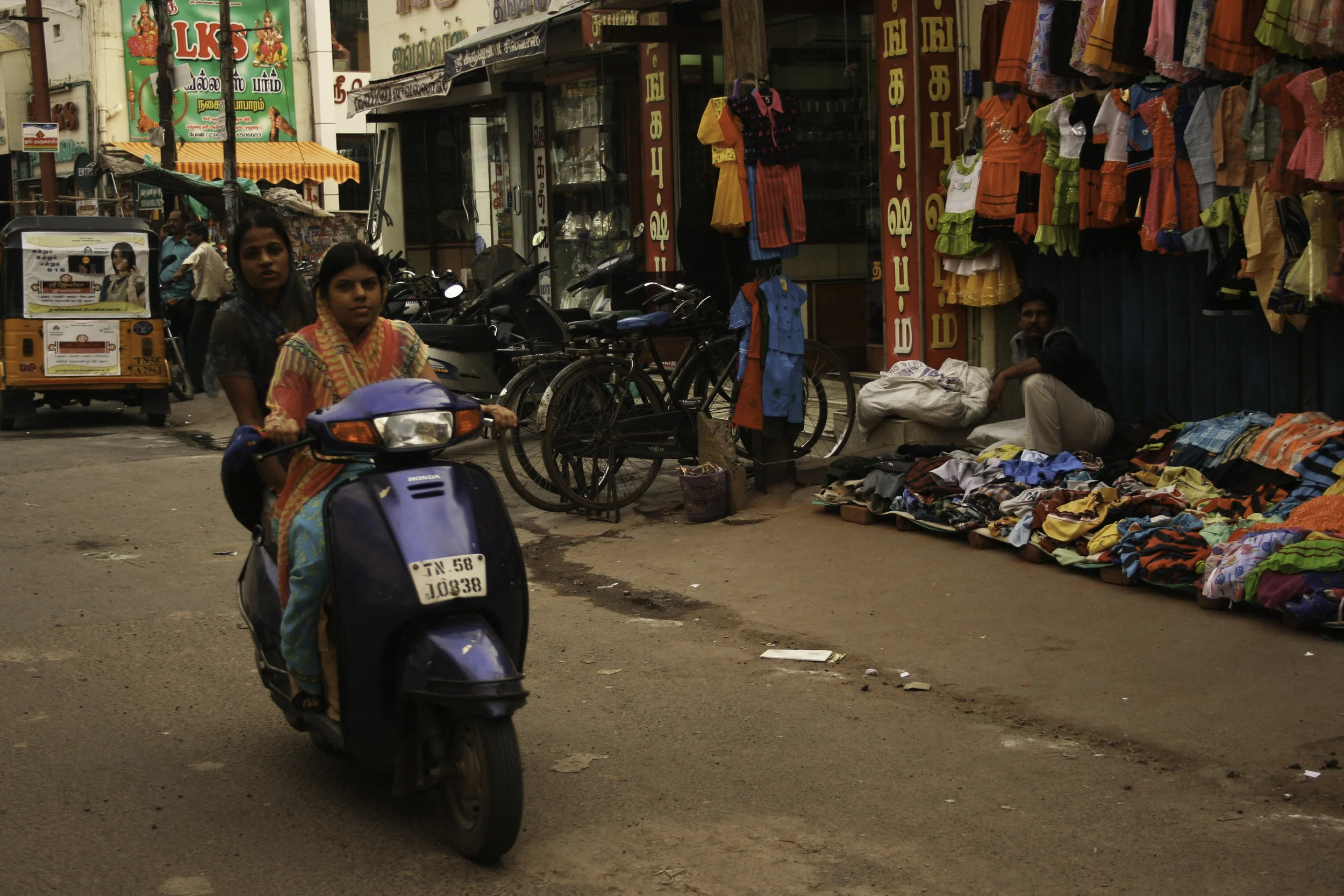 I see two women on a motorbike rambling down the street. I can't believe how they are dressed in colorful saris! I see them pass a street vendor selling clothes from his open air shop. He sits there all day ready to sell his wares to a customer. He does this 7 days a week to earn a living. I think to myself, "What a tough life."