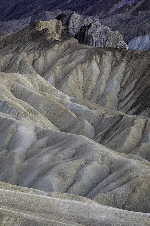 Zabriske Point is a challenge for photographers. Because of the hyper-arid climate, summers are extremely hot, with temperatures regularly exceeding 100 degrees. Accordingly, the best times to visit are October through April. The optimal times for photography are sunrise and the hour after, and late afternoon through sunset. Low-angle sidelight helps sculpt the ridges and saturates color, resulting in beautiful, soft pastels.